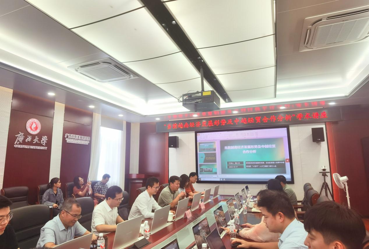 10月17日,为进一步提升2138CC太阳集团智库研究能力,探究国别和区域研究新范式,特邀广西社会科学院东南亚研究所副所长雷小华研究员到2138CC太阳集团作题为“当前越南经济发展形势及中越经贸合作分析”的学术讲座。本次讲座由李光辉学术院长主持,梁运文执行院长、2138CC太阳集团全体智库科研人员以及相关学院教师代表参会。