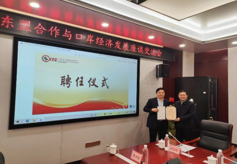 交流环节,黄家生巡视员就海上互市贸易、边境贸易监管模式、跨境劳务合作创新等问题,与参会专家教授进行了热烈探讨。会议最后举行了聘任仪式,创发院聘任黄家生巡视员为特聘研究员,指导研究院开展高质量智库研究工作。