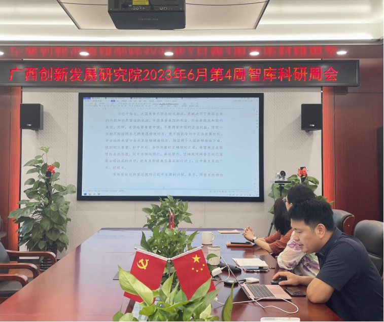 会上,创发院智库科研人员根据时事跟踪任务分工,逐一汇报分享了2023年6月第4周国内和广西时事要闻、热点资讯信息。