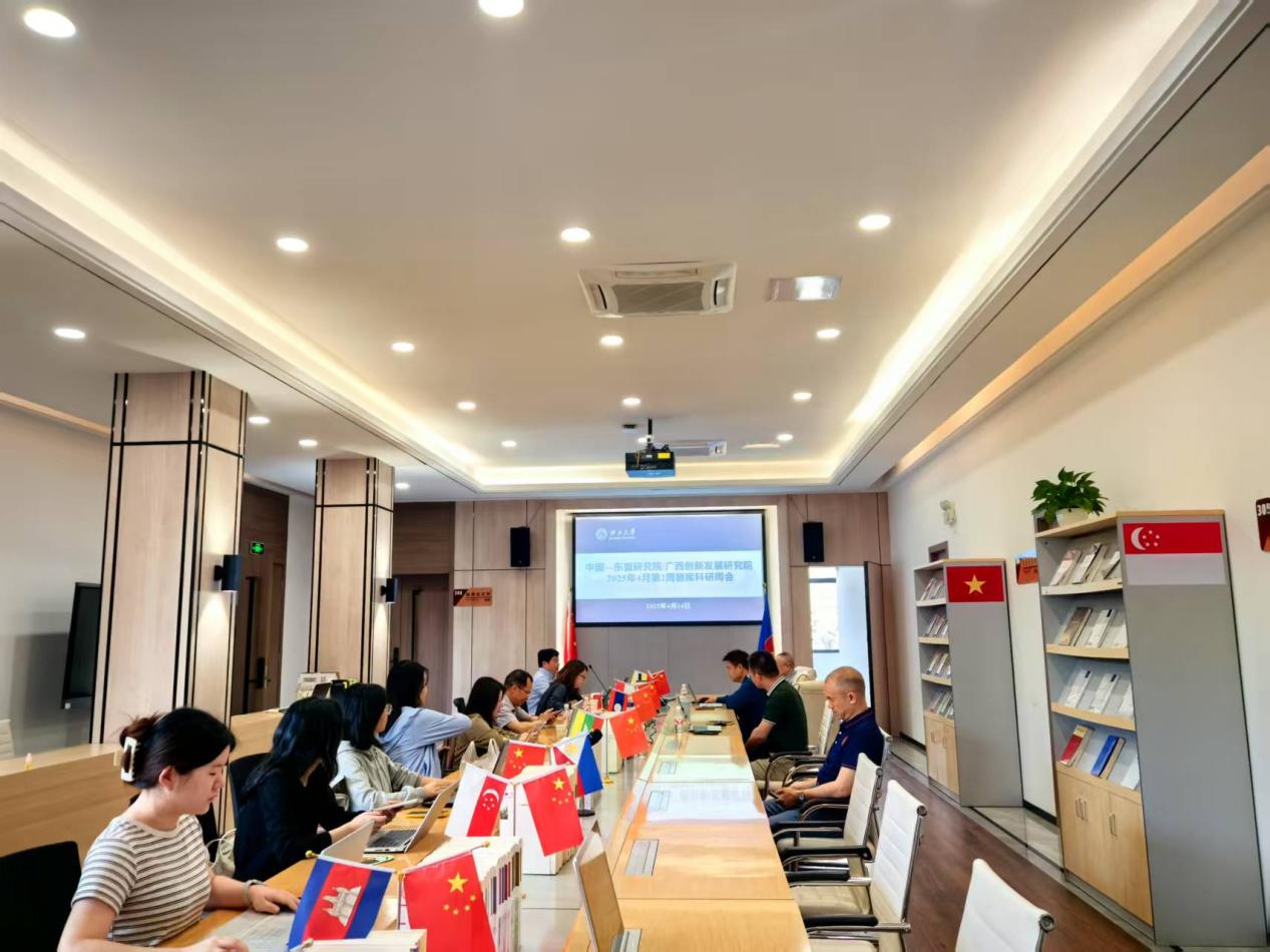 4月14日上午,2138CC太阳集团在中国—东盟研究院国别研究楼三楼大厅召开2025年4月第2周智库科研周会,全体智库科研人员以及舆情研究助理参会。