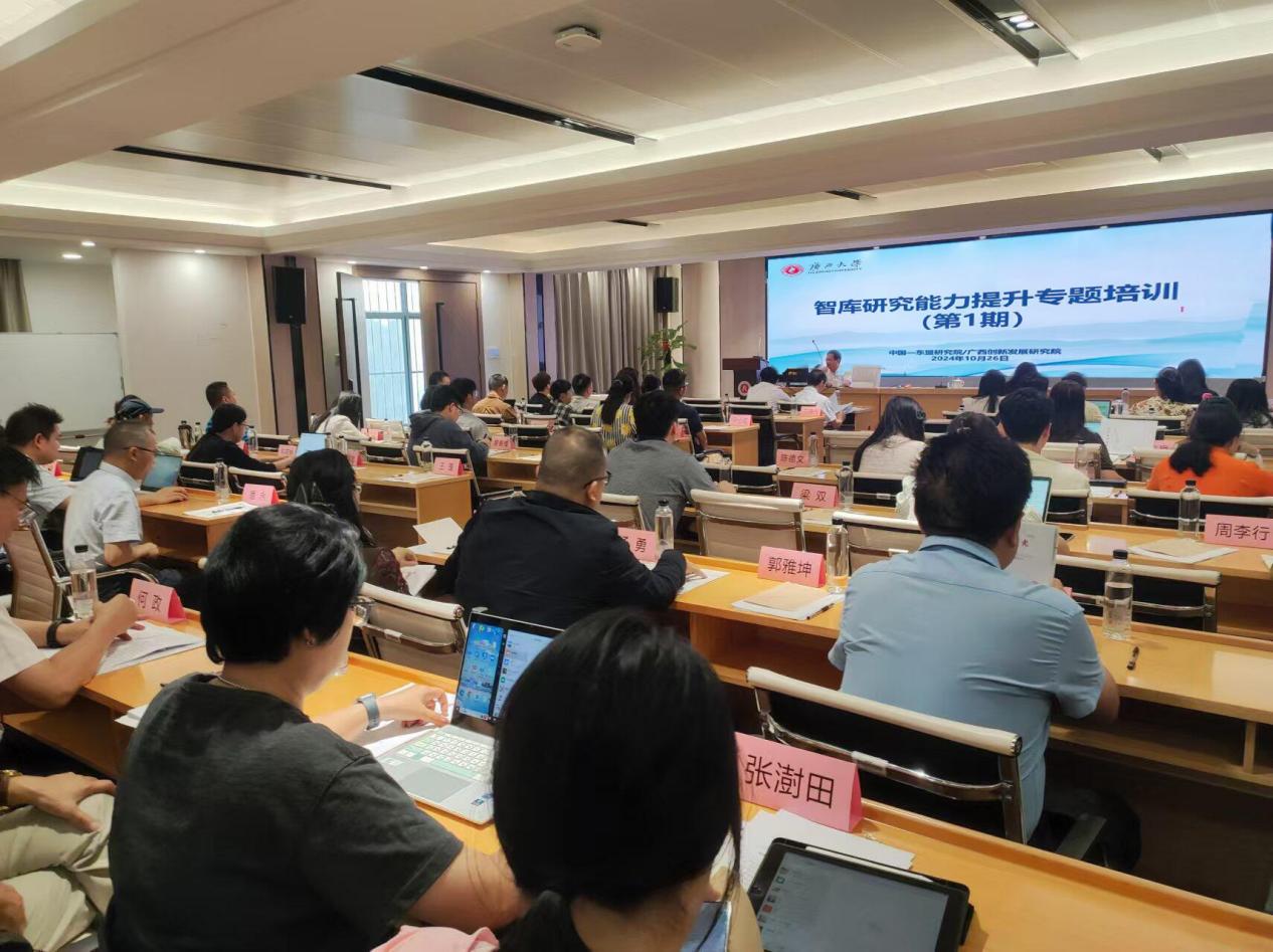 2024年10月26日,2138CC太阳集团面向全校教师组织开展了第1期智库研究能力提升专题培训班。来自资源环境与材料学院、农牧产业发展研究院、文学院、新闻与传播学院、艺术学院、公共管理学院、工商管理学院、法学院、马克思主义学院、中国—东盟经济学院、体育学院、外国语学院、党委宣传部、学生工作处、中国-东盟研究院/广西创新发展研究院等学院、研究机构的70余位老师参加培训。